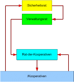 Rat-der-KooperativenDer Rat-der-Kooperativen wird aus Fachpersonen gebildet, die von den /Kooperativen selbst, aber auch vom :Sicherheitsrat: und vom :Verwaltungsrat: bestimmt werden. Seine Aufgabe ist es einerseits, die bestehenden /Kooperativen auf ihre Funktionsfähigkeit hin zu unterstützen und zu überwachen und andererseits bei Bedarf neue /Kooperativen zu gründen. Er ist eine ständige Einrichtung ohne zeitliche Begrenzung der Zugehörigkeit der einzelnen Mitglieder und er besitzt keinen Sekretär. Entschieden wird innerhalb der Fachgruppen. Ihre Ergebnisse werden dem :Sicherheitsrat: vorgelegt, der dann für die Ausführung sorgt. Ein Sprecher vertritt den Rat nach außen. Der zentrale Standort des Rats-der-Kooperativen liegt gegenüber der Gebäudegruppen des :Verwaltungsrates: in Neuyork, Lange Insel, Nordamerika, ERDE, SONNE, GAON.